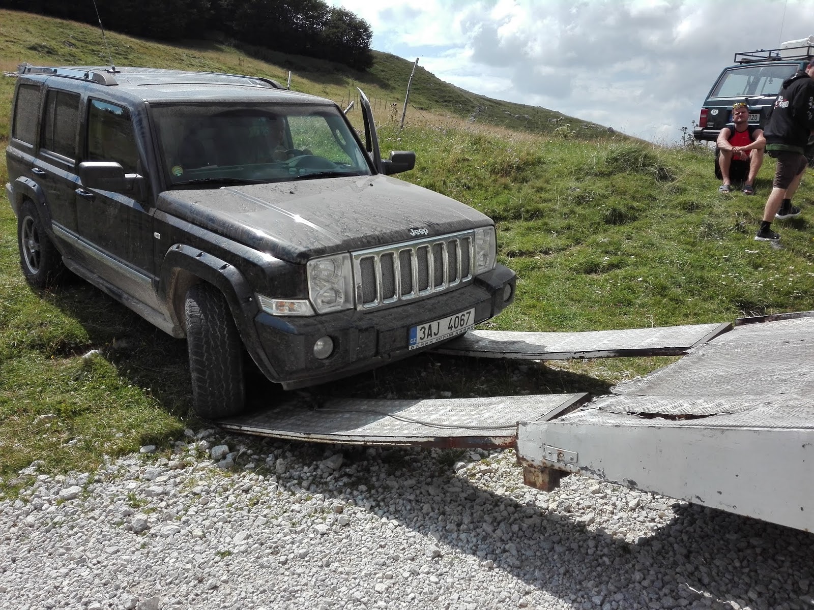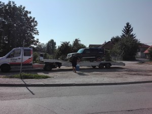 Ještě, že měl Honza ten dobrý nápad, pojistit odtah auta. V Kooperativě, kde jsme měli pojistku sjednanou, byli milý a vstřícní a hned začali shánět někoho kdo nás na odtahovce sveze z hor. Trvalo to sice dlouho(až do odpoledne), ale nakonec po x telefonátech dorazila ze Sarajeva odtahovka. Ačkoliv jsme několikrát hlásili jakou hmotnost má naše auto, přijel malý Renault Master. Zřejmě žádnou větší odtahovku, která by byla ochotná dojet pro nás do hor,( i když po ,,oficiální cestě“) nenašli. Pán lamentoval a rozhazoval rukama hned jak dojel a to se pak ještě zhoršilo, když mu naše těžké auto při natahování na odtahovku zlomilo nájezdy. Cesta z hor zpět do Sarajeva do autorizovaného servisu Jeep byla pro odtahové auto na hranici únosnosti. Vypadalo to, že se pod tíhou našeho auta každou chvíli rozpadne. Ale nějakým zázrakem jsme dojeli! Cestou jsme se ještě zastavovali nechat svařit zlomené nájezdy, které se ale stejně zase při skládání auta v servisu zlomili! Pán už přestal lamentovat a jen odevzdaně koukal! Tak jsme trochu zariskovali a za ochotu nabídli řidiči láhev Becherovky! V muslimské zemi je alkohol velký prohřešek, ale pán buď nebyl muslim a nebo to nějak nehrotil, protože nabízenou láhev přijal.