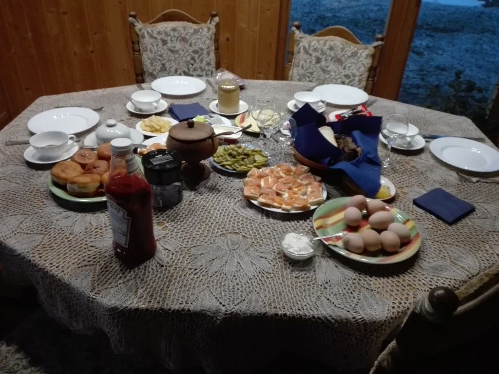 Byli jsme tak unaveni, že po malé večeři jsme všichni odpadli jak mimina. V noci se nám spalo dobře, jen v baráčku měli strašný vedro, takže jak my, tak i Honza s Týnkou celou noc větrali. Teprve až ráno u snídaně, nám to došlo……. Když Týnka ubytování objednávala, podle fotky vypadal baráček jako nějaká zahradní bouda. A tak psala majiteli jestli se v baráčku topí. Majitel odpověděl rozesmátým smajlíkem a tak jsme usoudili, že nejspíš ano. Zřejmě si tedy podle korespondence myslel, že jsme nějací zmrzlíci a proto pořádně naložil do kotle. Každopádně to od něj bylo velmi milé!